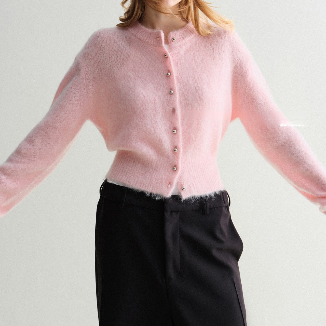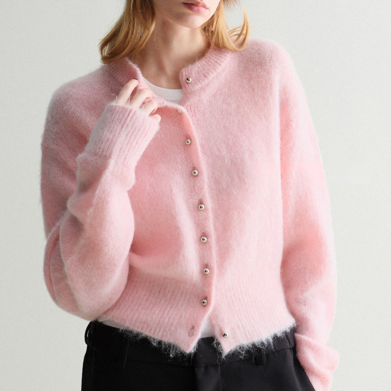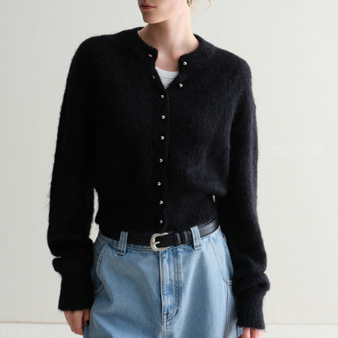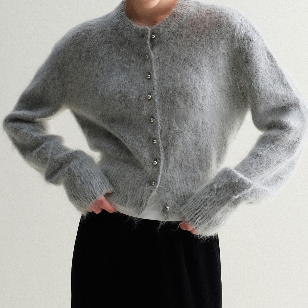 モヘアタッチショートカーディガン 上品クルーネックデザイン T003
