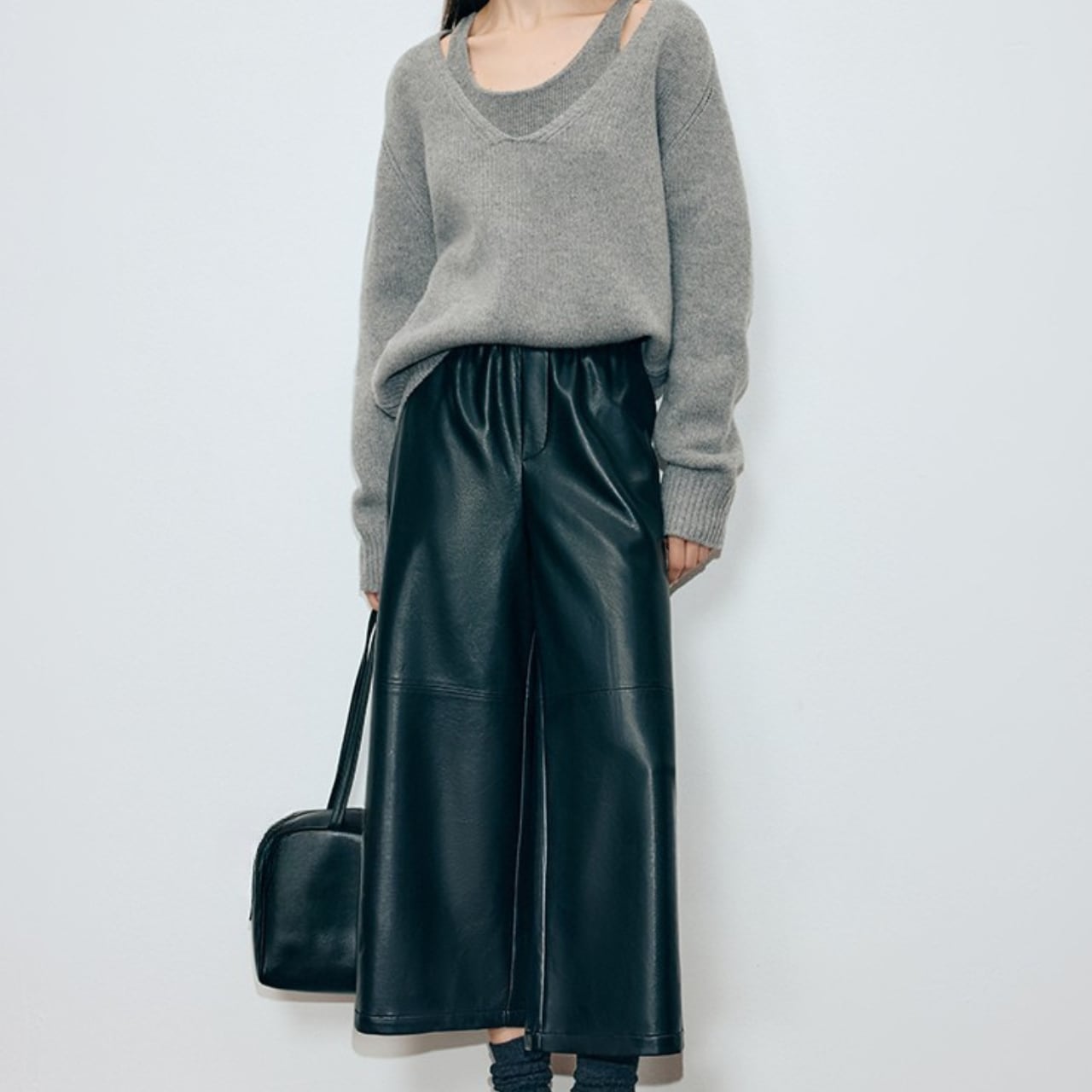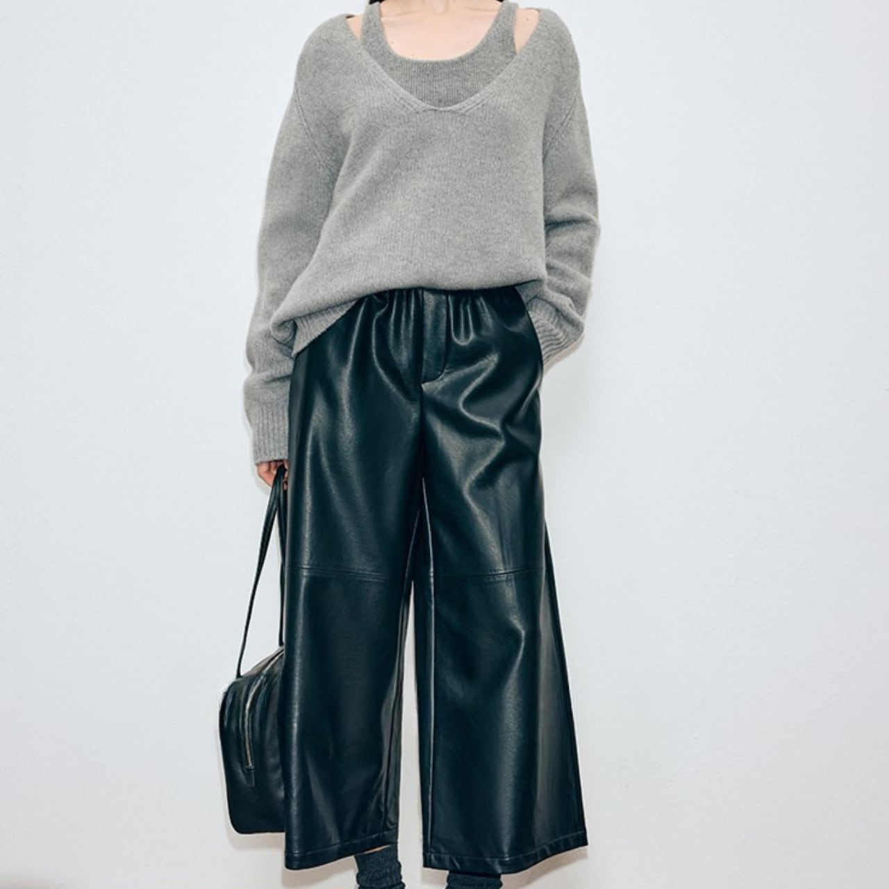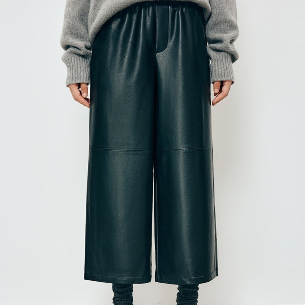 ウエストゴム フェイクレザー パンツ クロップド丈 P001