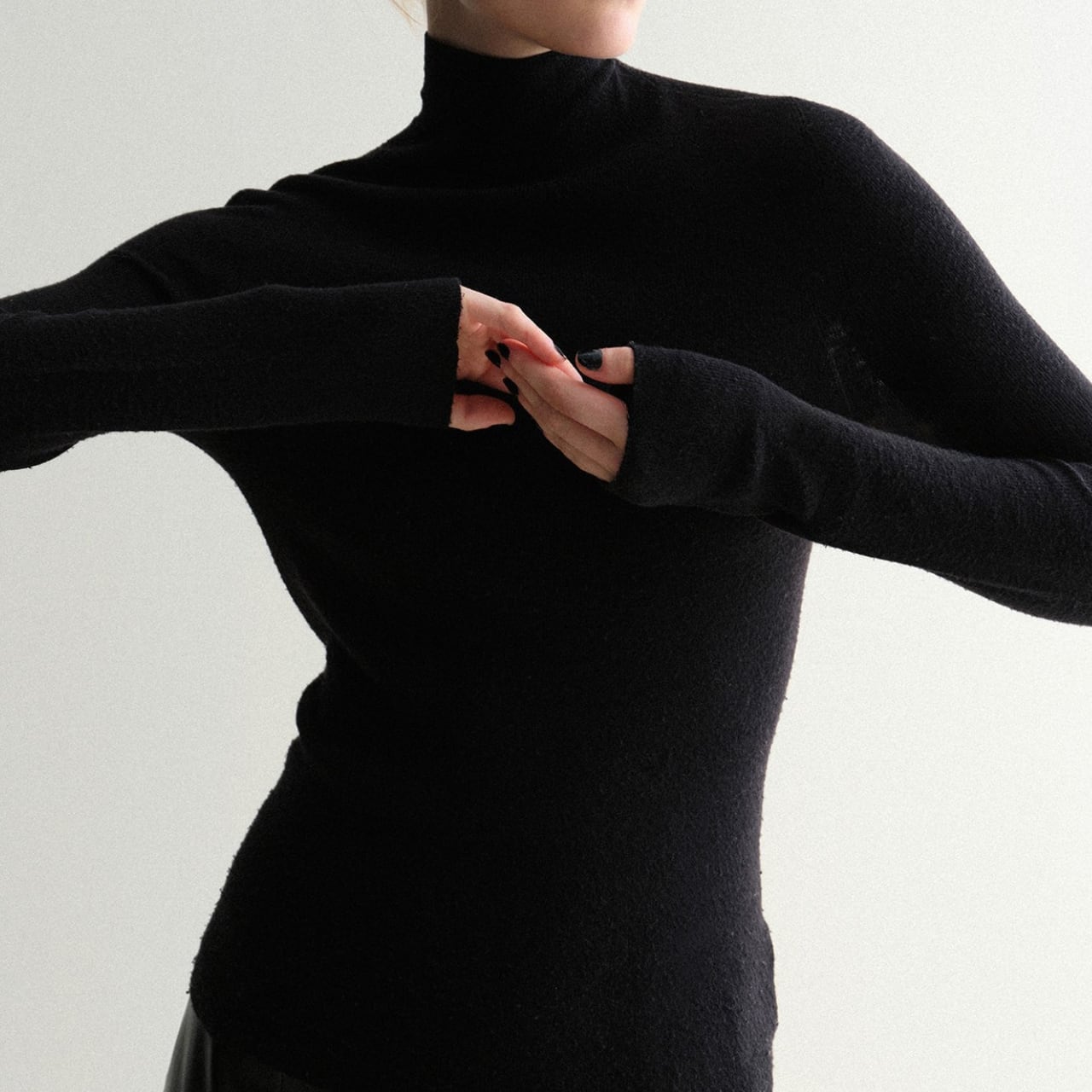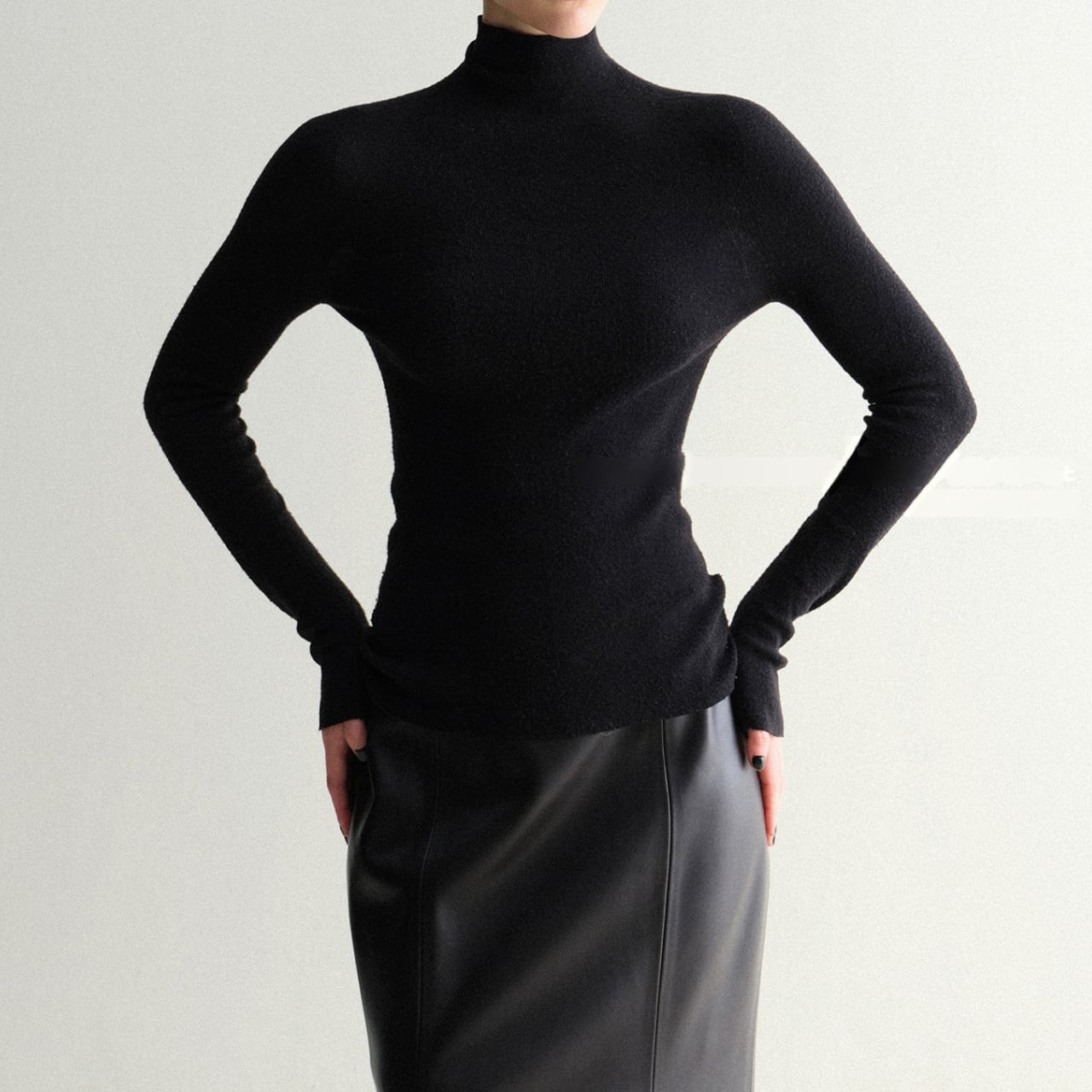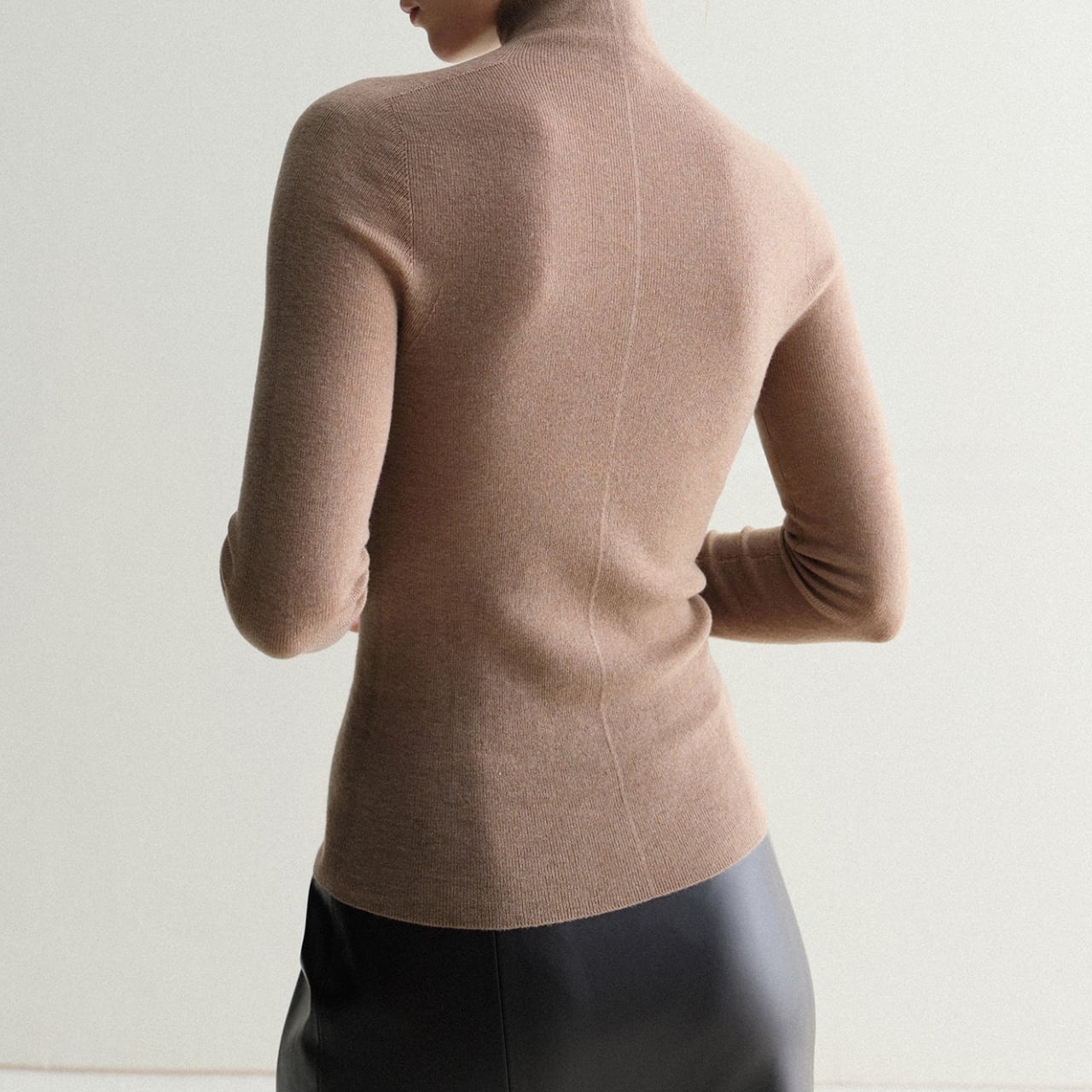 タートルネックが首元を優しく包み込み、暖かさを保ちます。