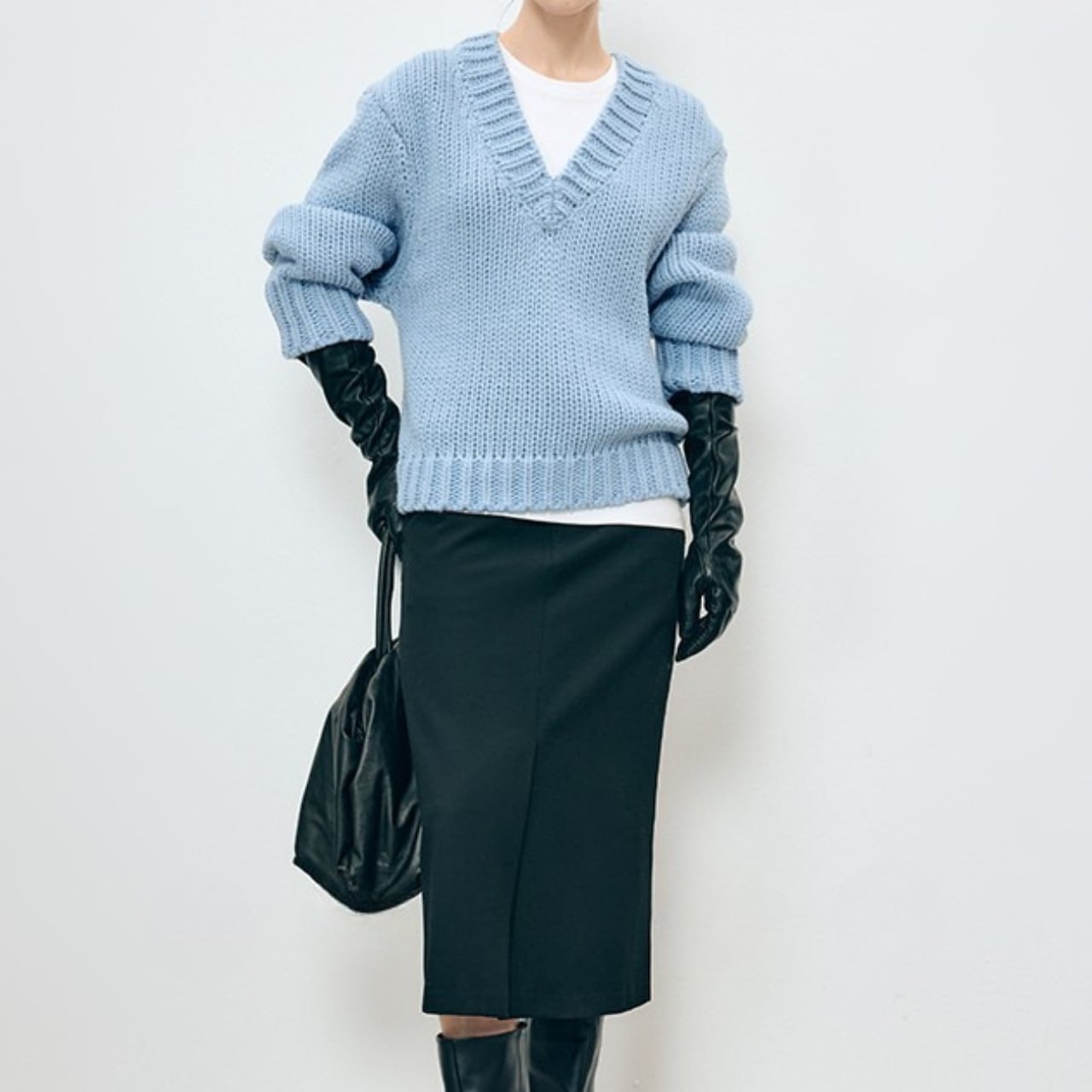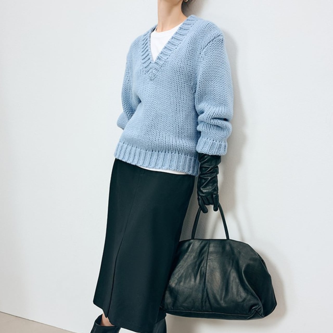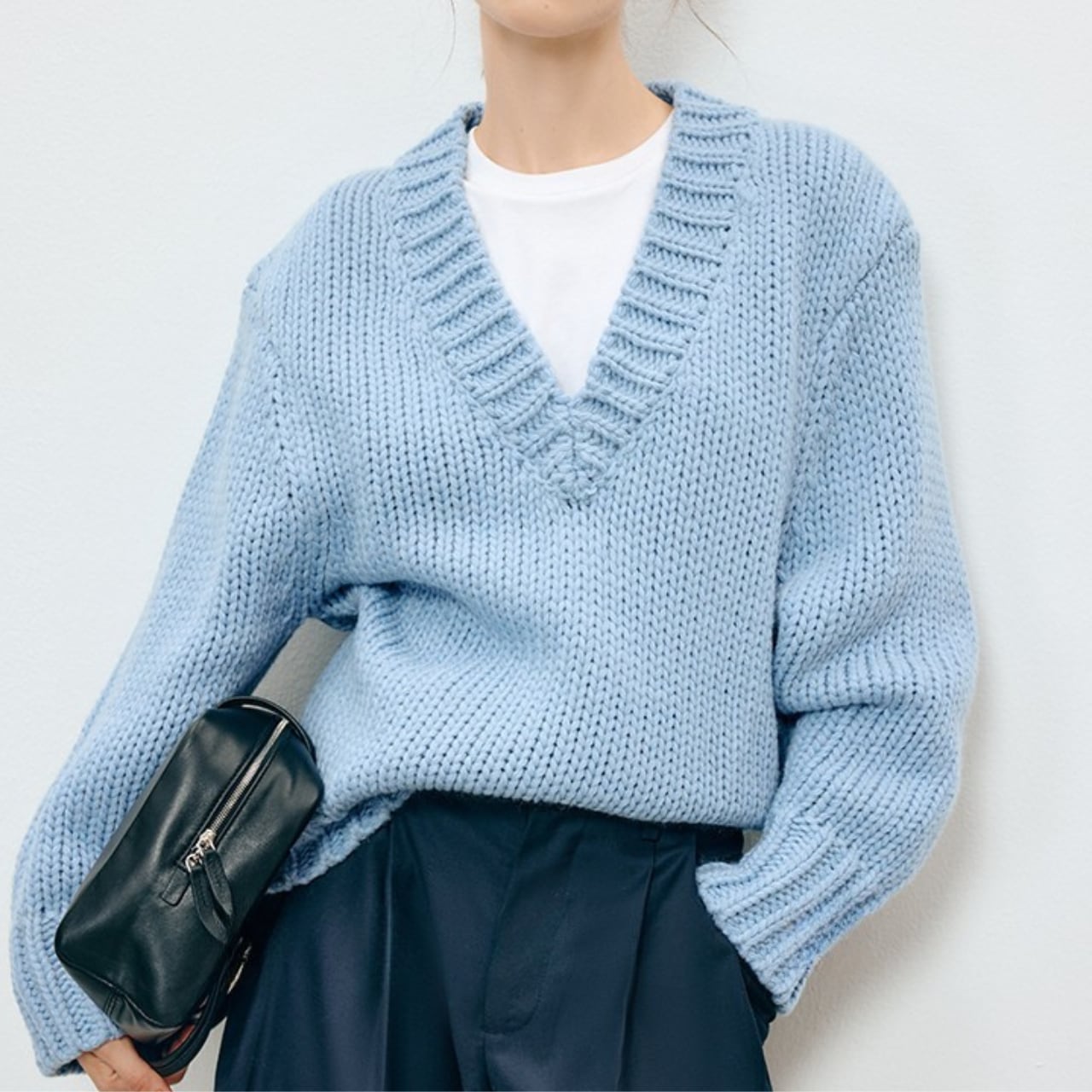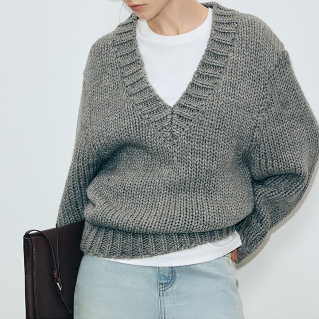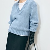 Vネックがシャープな印象を与える、オーバーサイズニット。