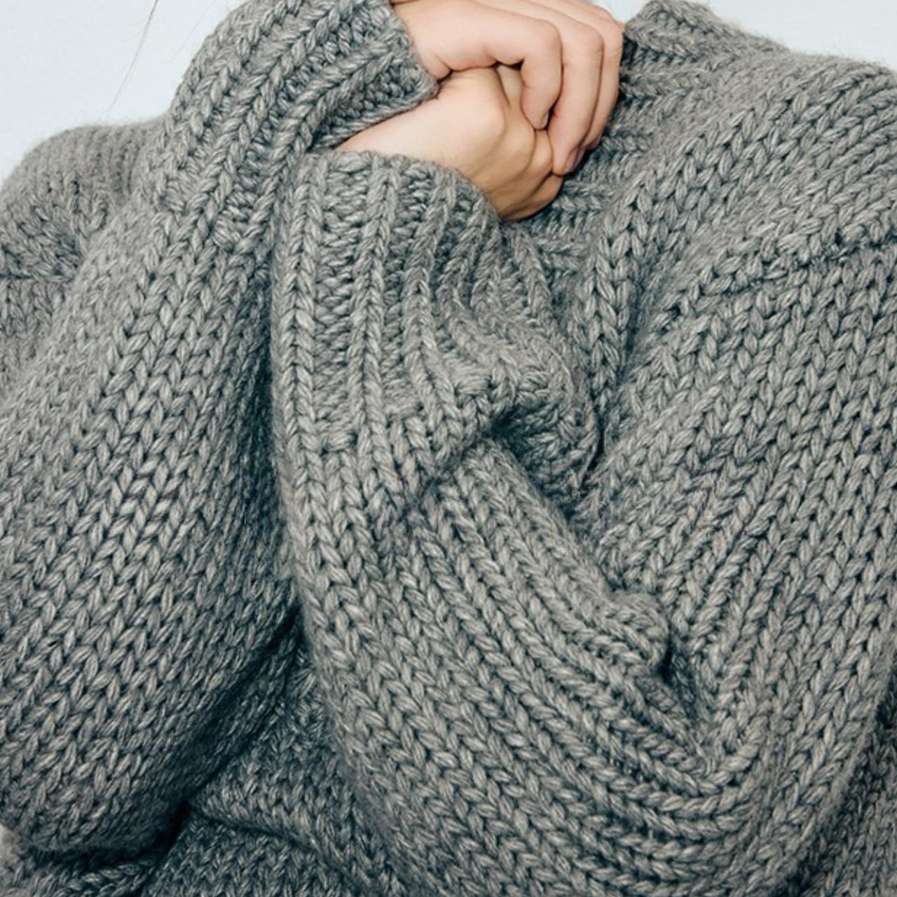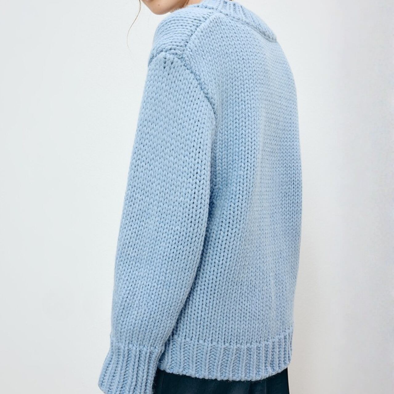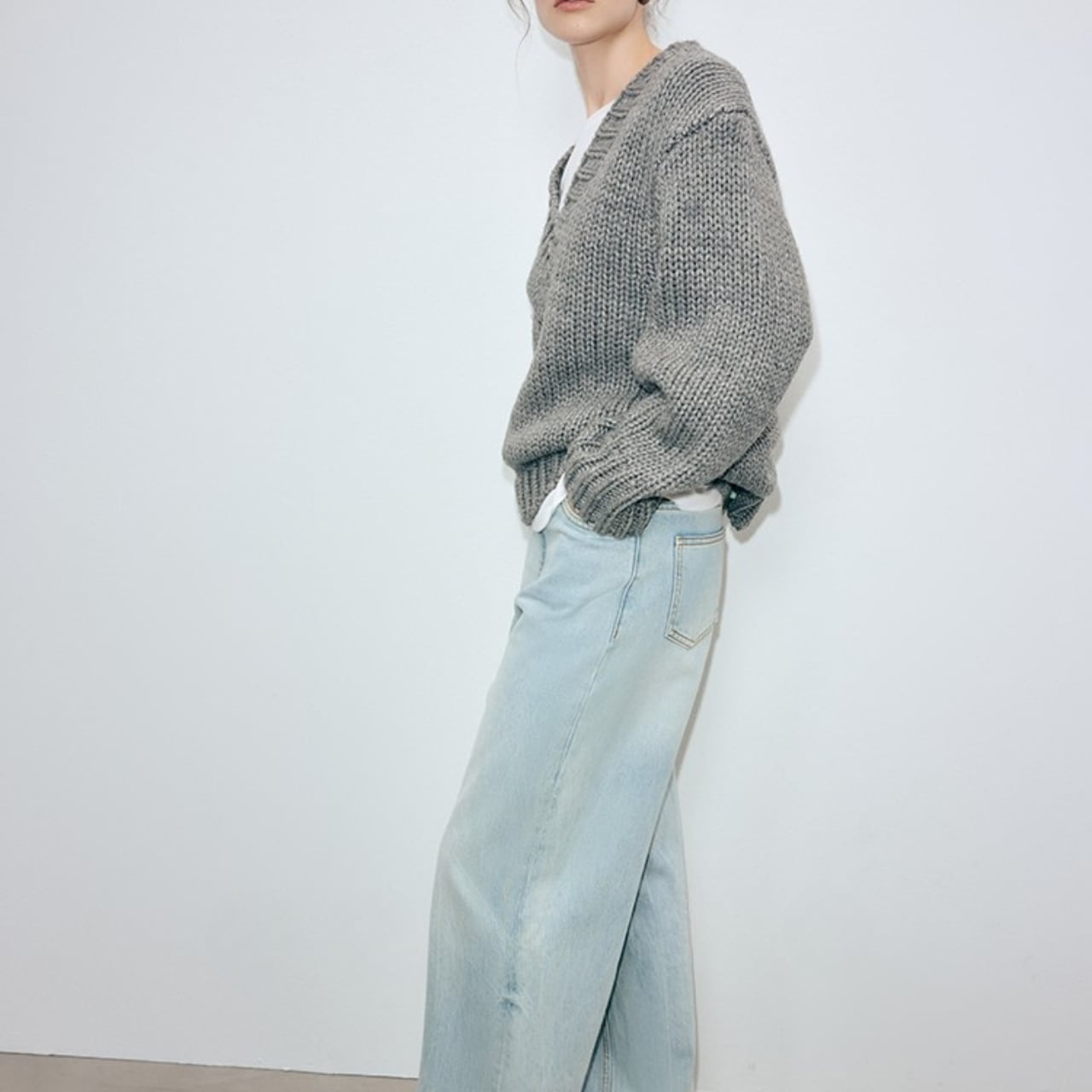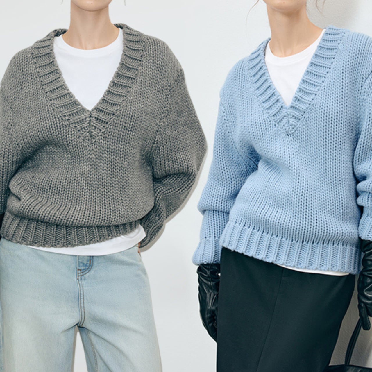 Vネックがシャープな印象を与える、オーバーサイズニット。