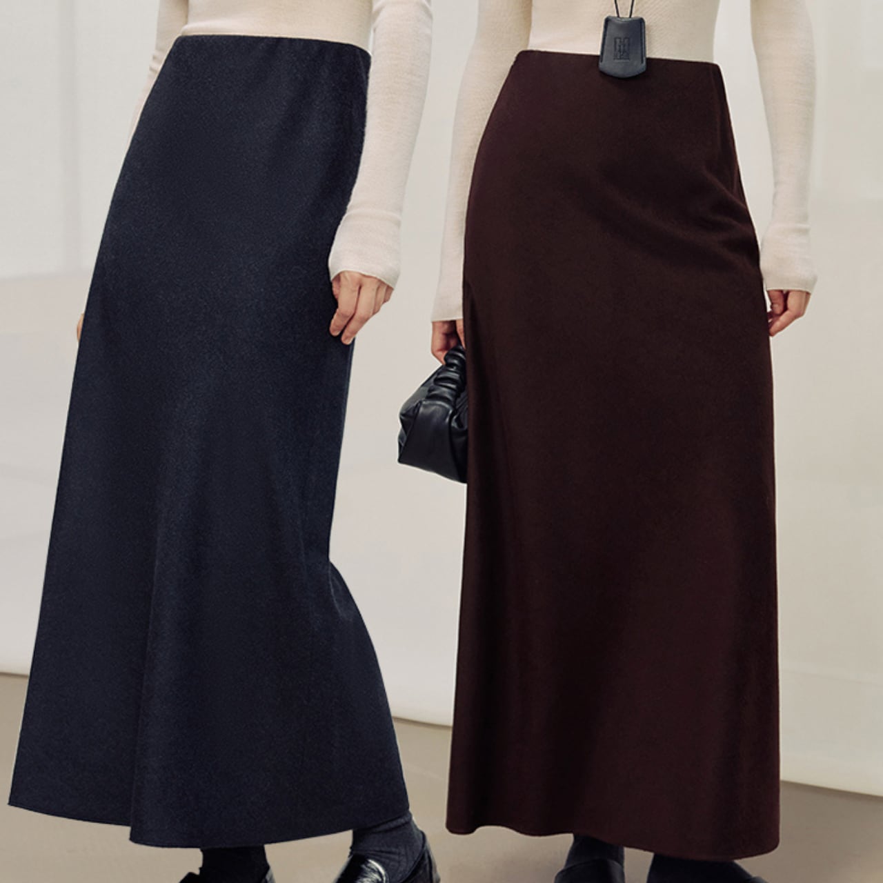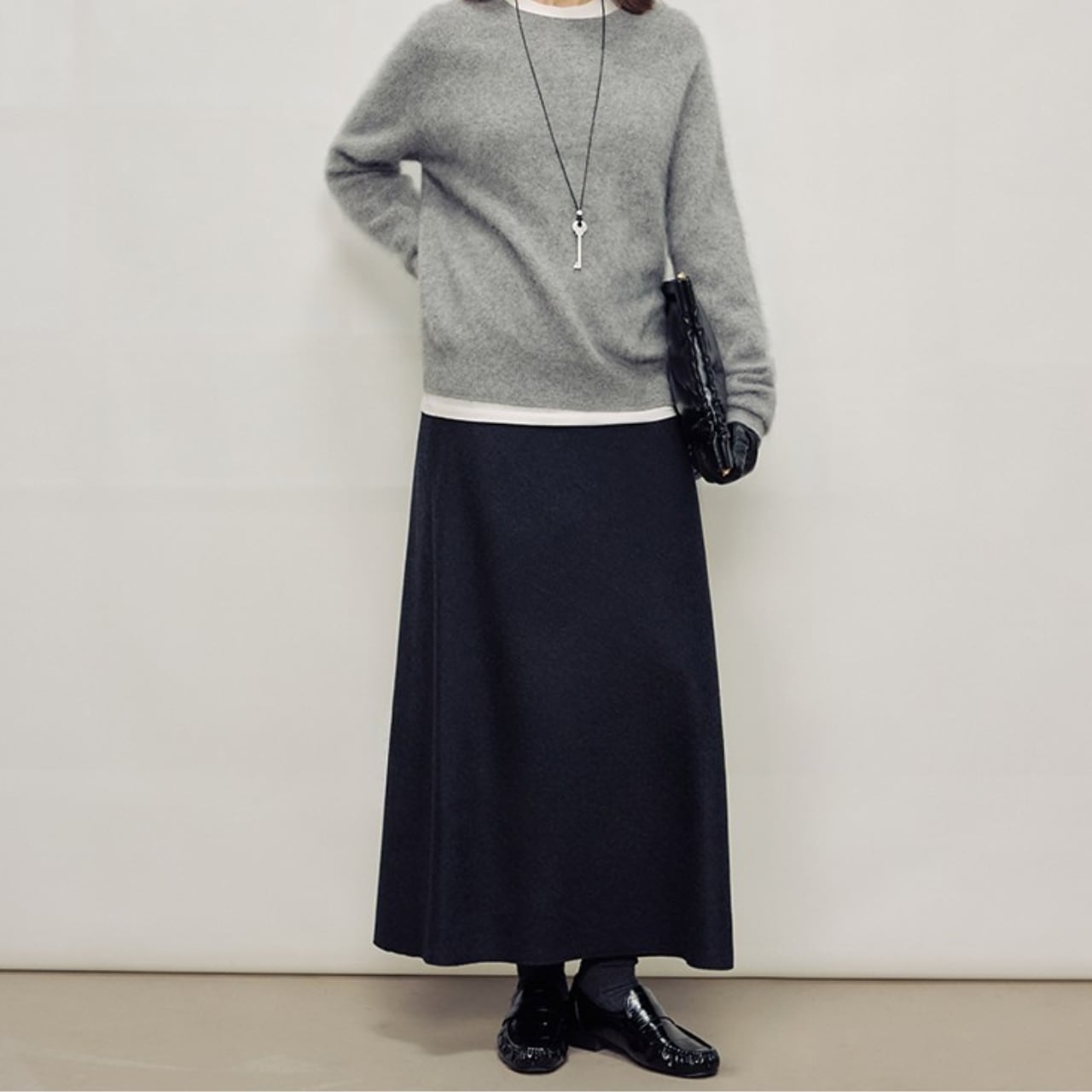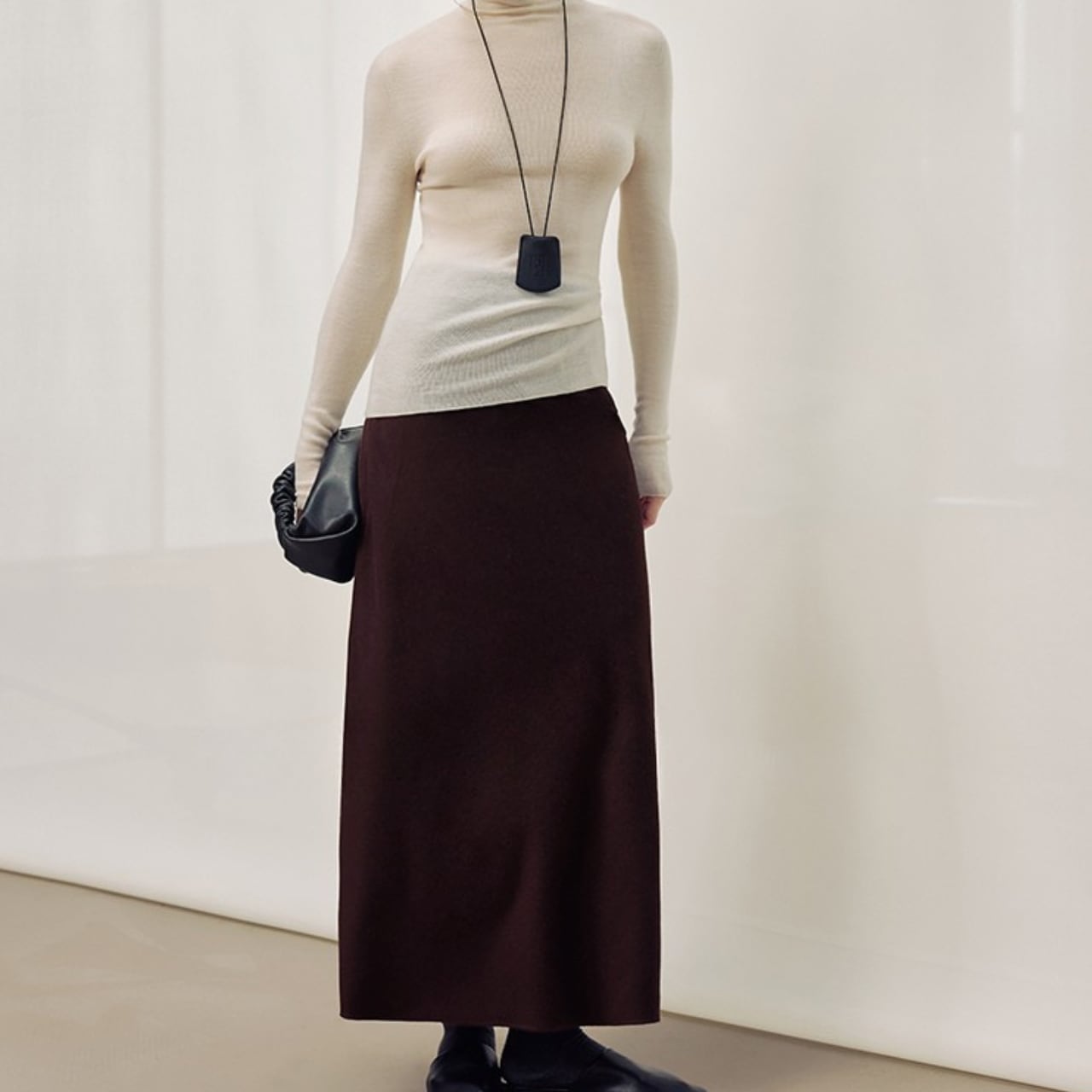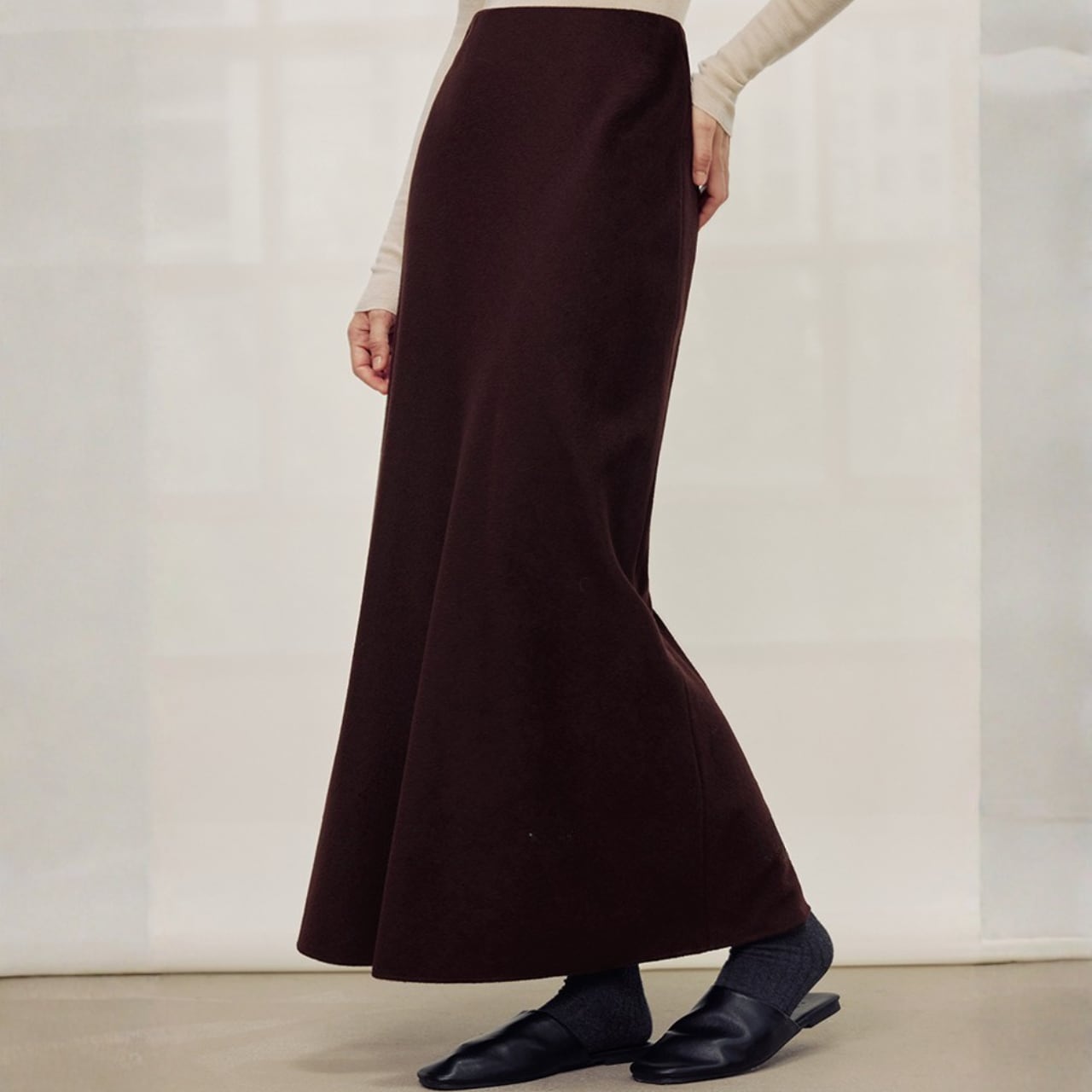 シンプルなデザインで、様々なトップスと相性の良いマキシ丈スカート。