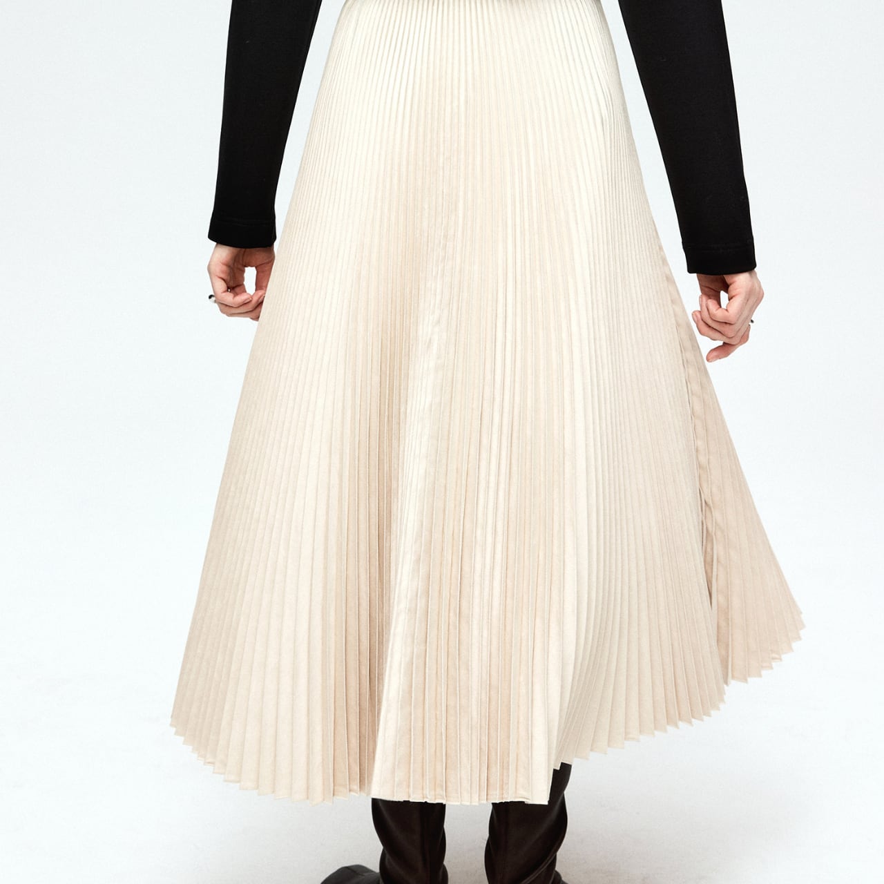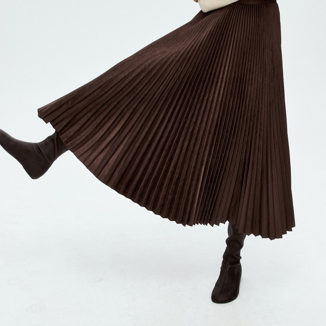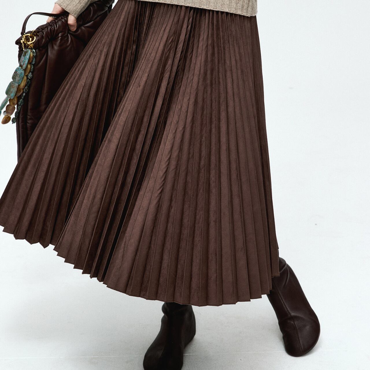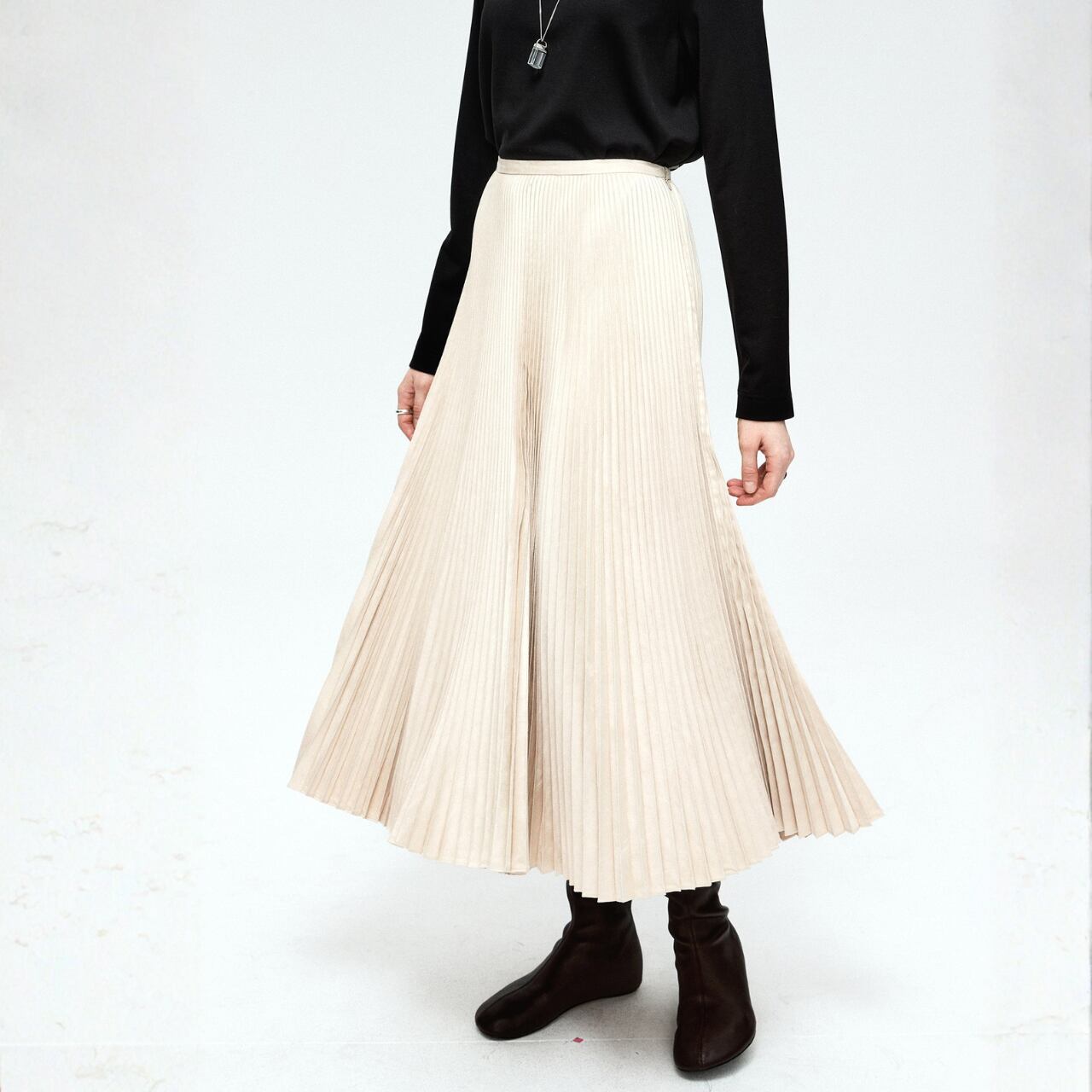 縦のラインを強調するプリーツ加工が施されたスカート。