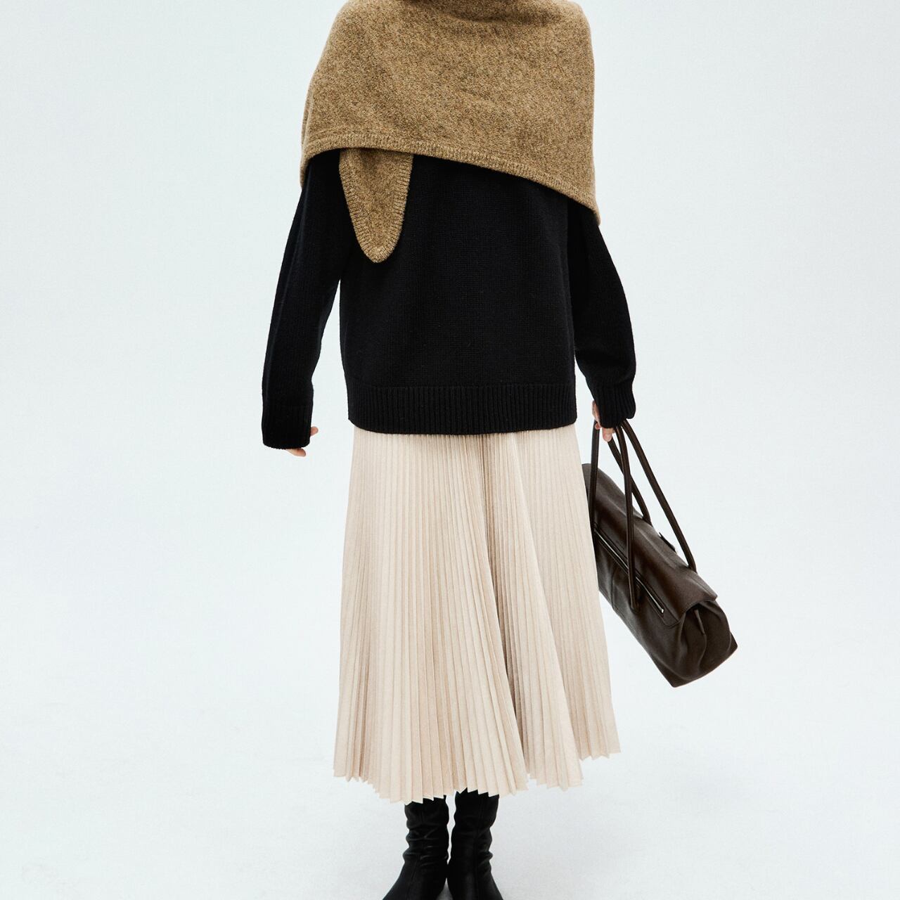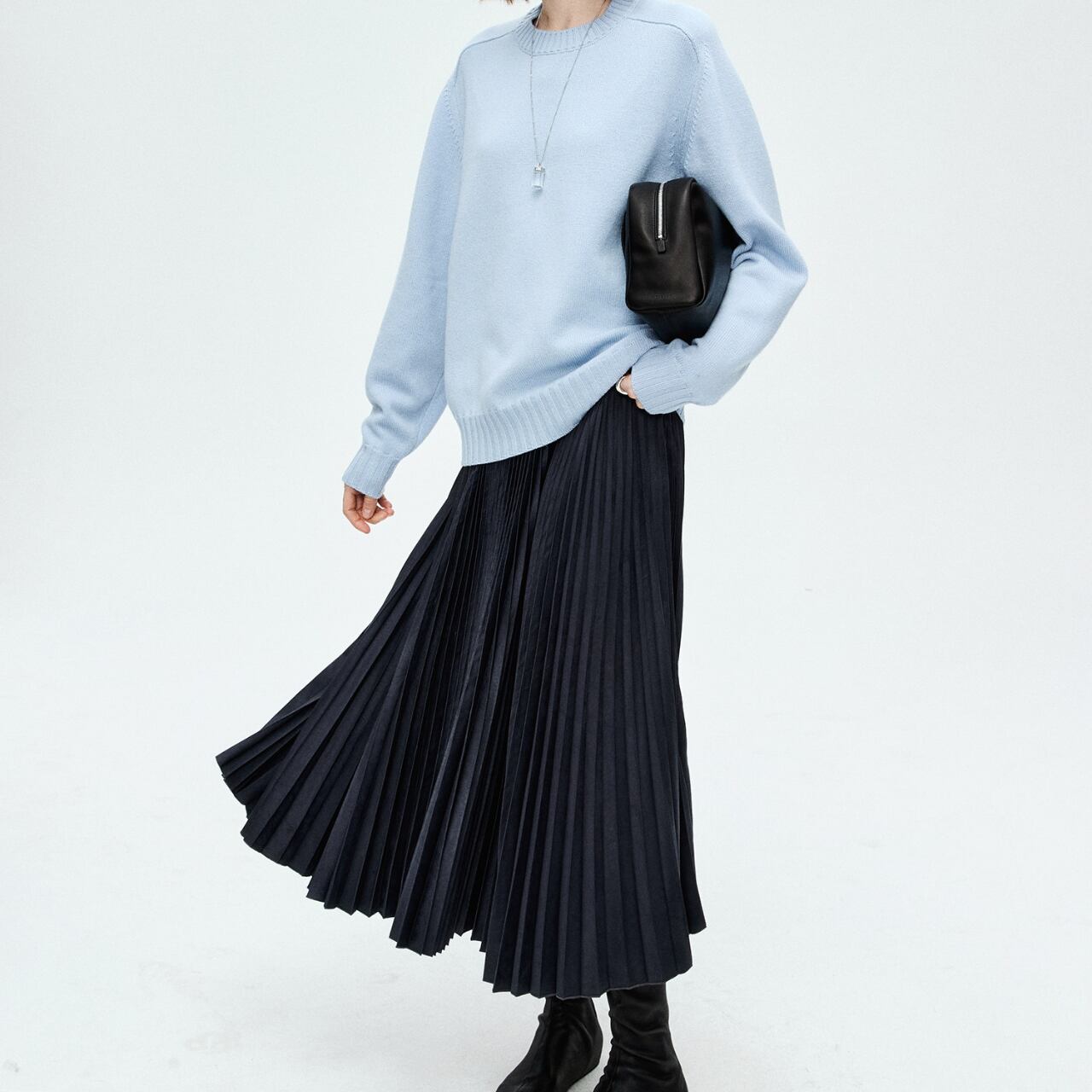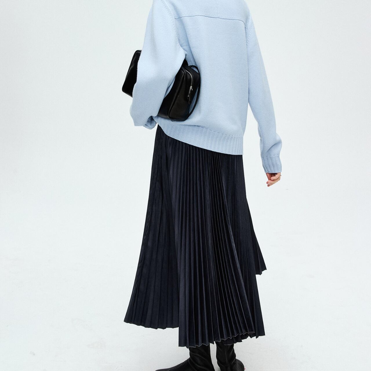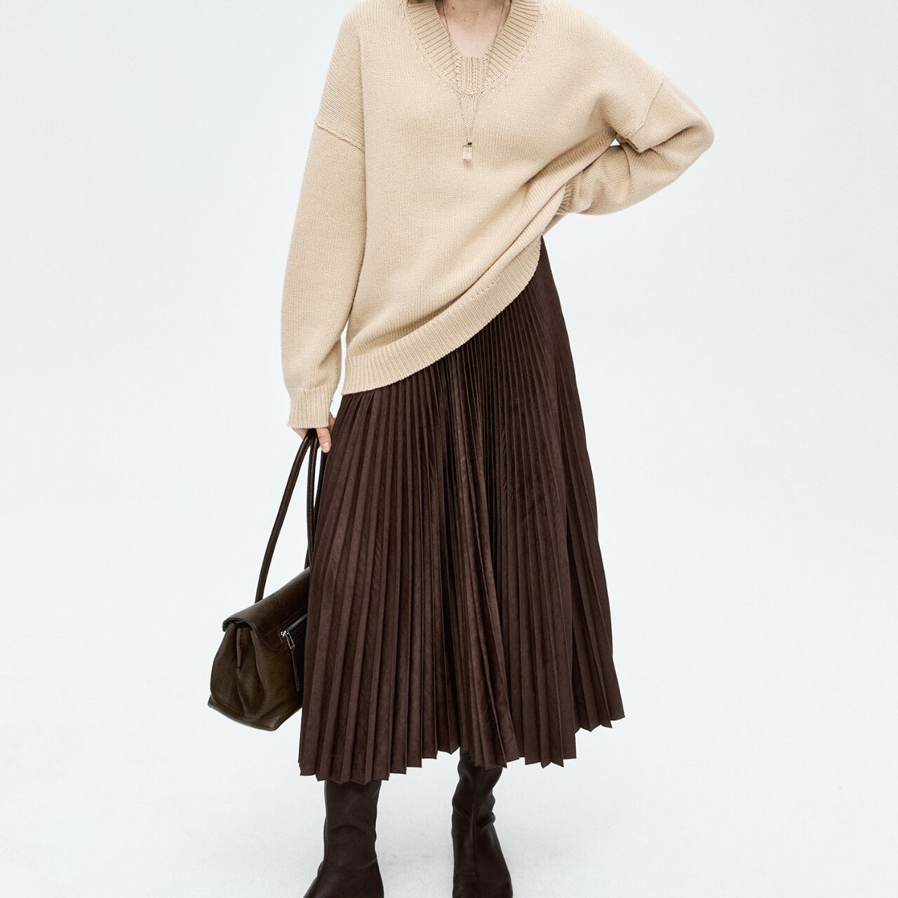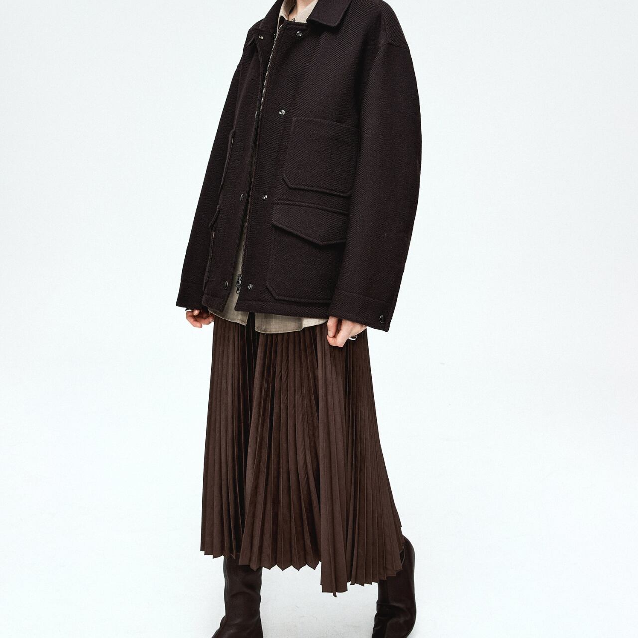 縦のラインを強調するプリーツ加工が施されたスカート。