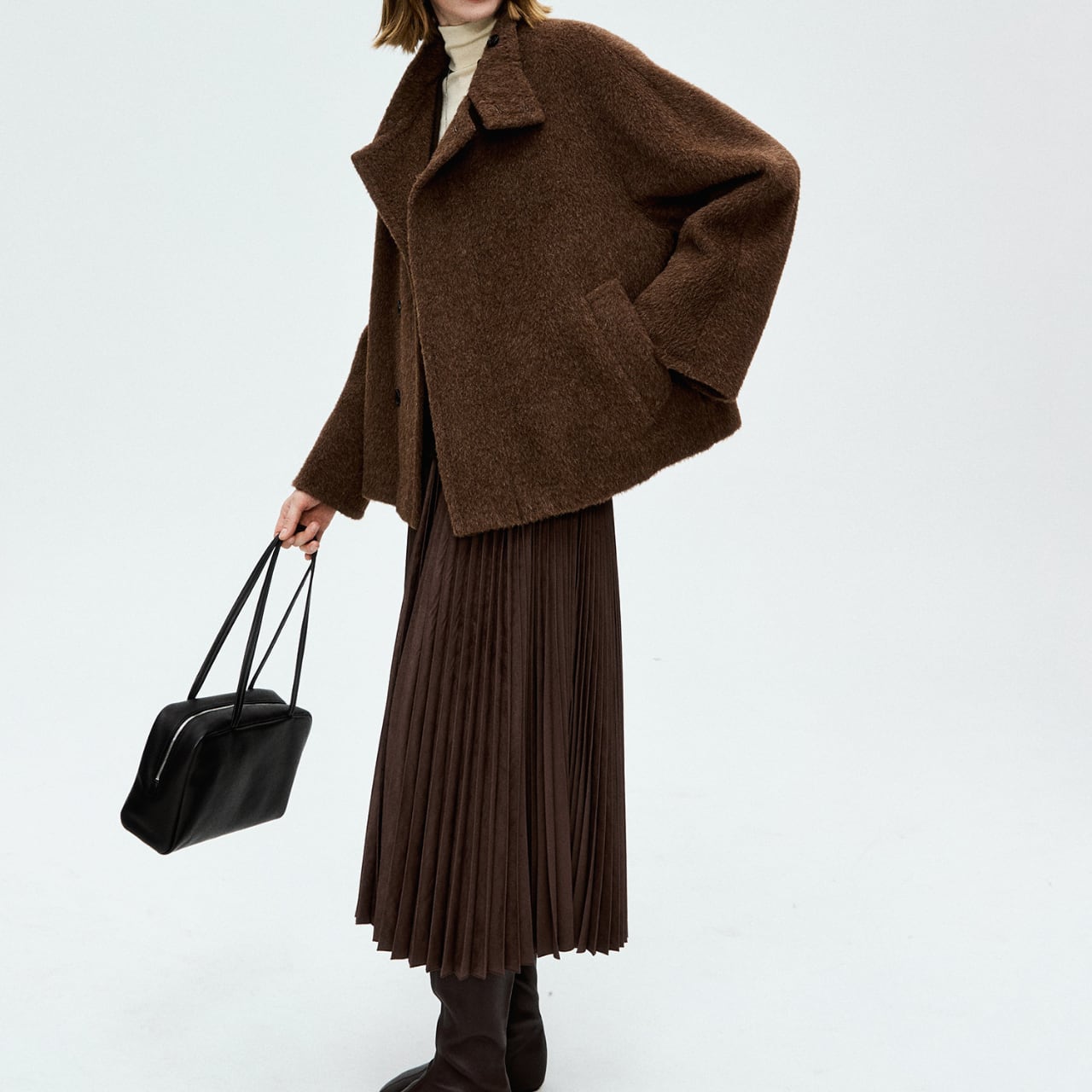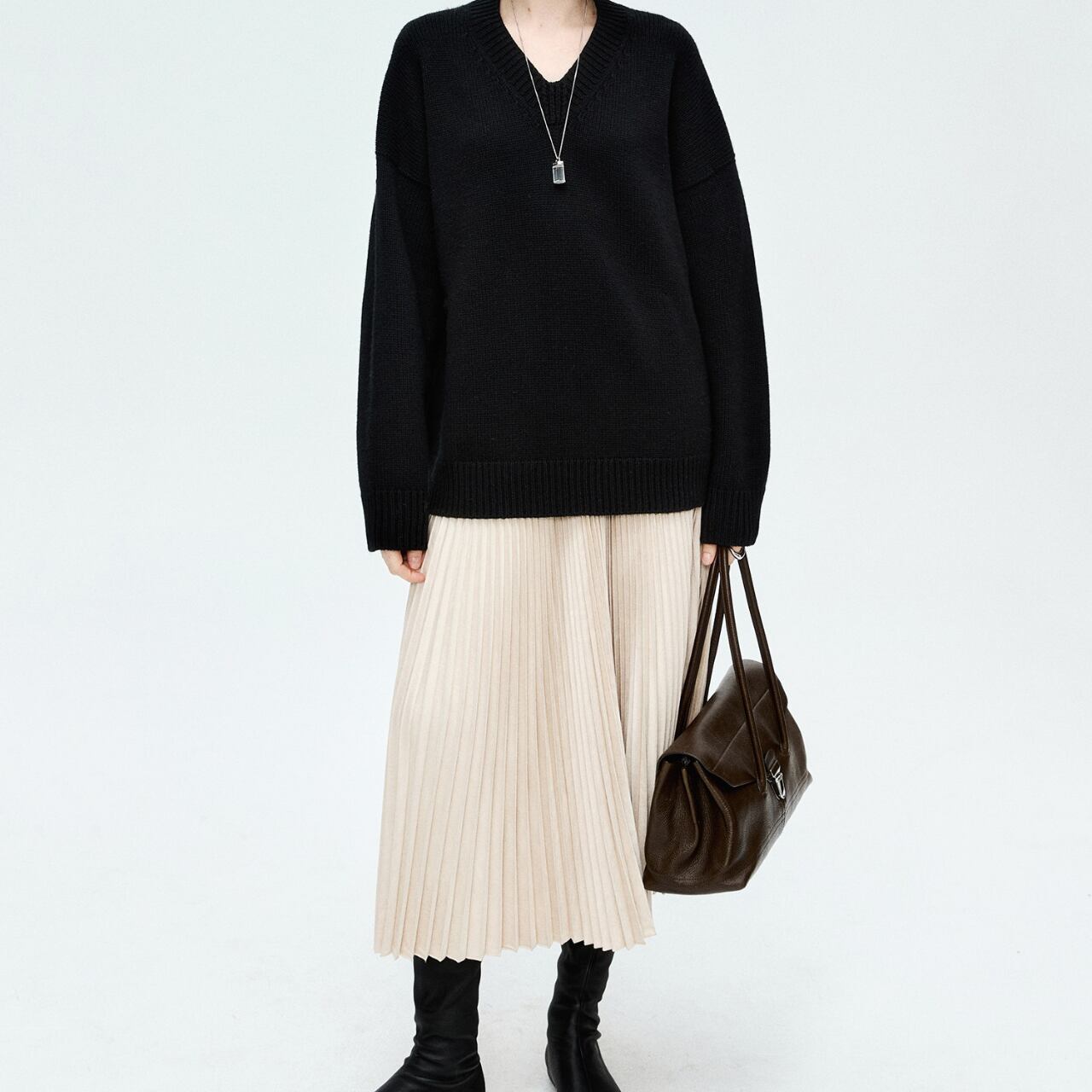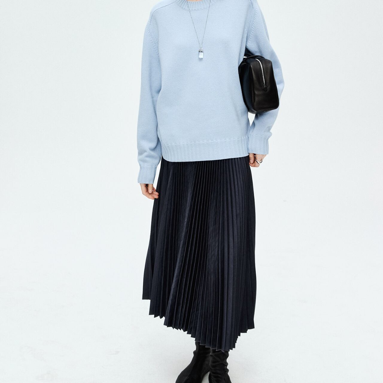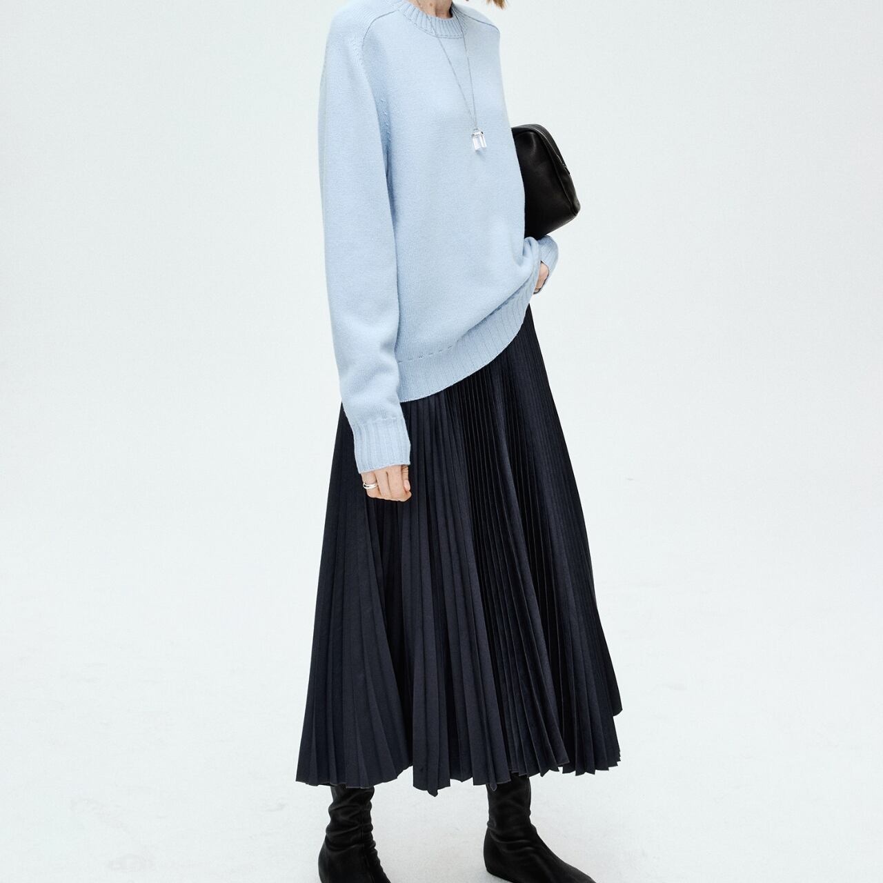 縦のラインを強調するプリーツ加工が施されたスカート。